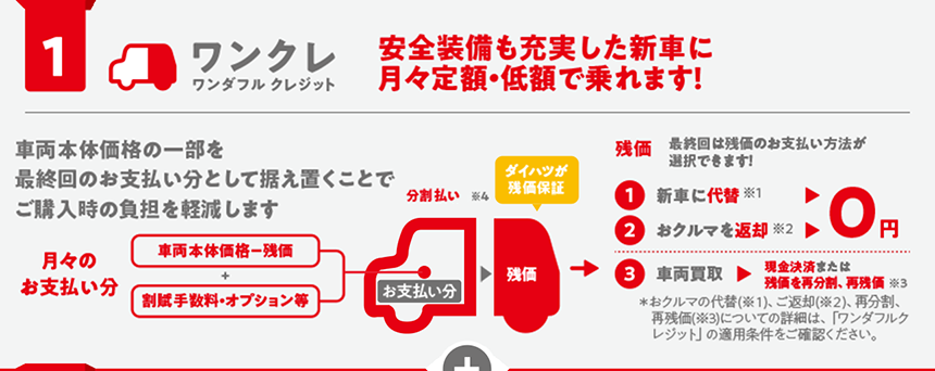 ●設定残価は、車両状態が規定内である場合のみ保証いたします。●ご購入いただいた販売会社に車両をご返却の上、新車にお乗り換えの場合(※1)、およびご購入いただいた販売会社にご返却の場合(※2)、残価分のお支払いは不要ですが、車両状態が事前に定められた規定外である場合には、別途精算金をいただきます。●最終回でお買い上げ(現金決済・再分割・再残価)をご選択された場合、最終回のお支払額(残価)を含めたお支払合計額は、一般的なローンの方が軽くなる場合があります。●お買い上げの際に再分割、再残価も選択できます。(※3)●お支払い期間については、販売会社により設定が異なります。(※4)詳しくは販売会社スタッフにお問い合わせください。