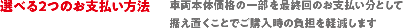 • 最終回でお買い上げ(現金決済・再分割・再残価)をご選択された場合、最終回のお支払額(残価)を含めたお支払合計額は、一般的なローンの方が軽くなる場合があります。